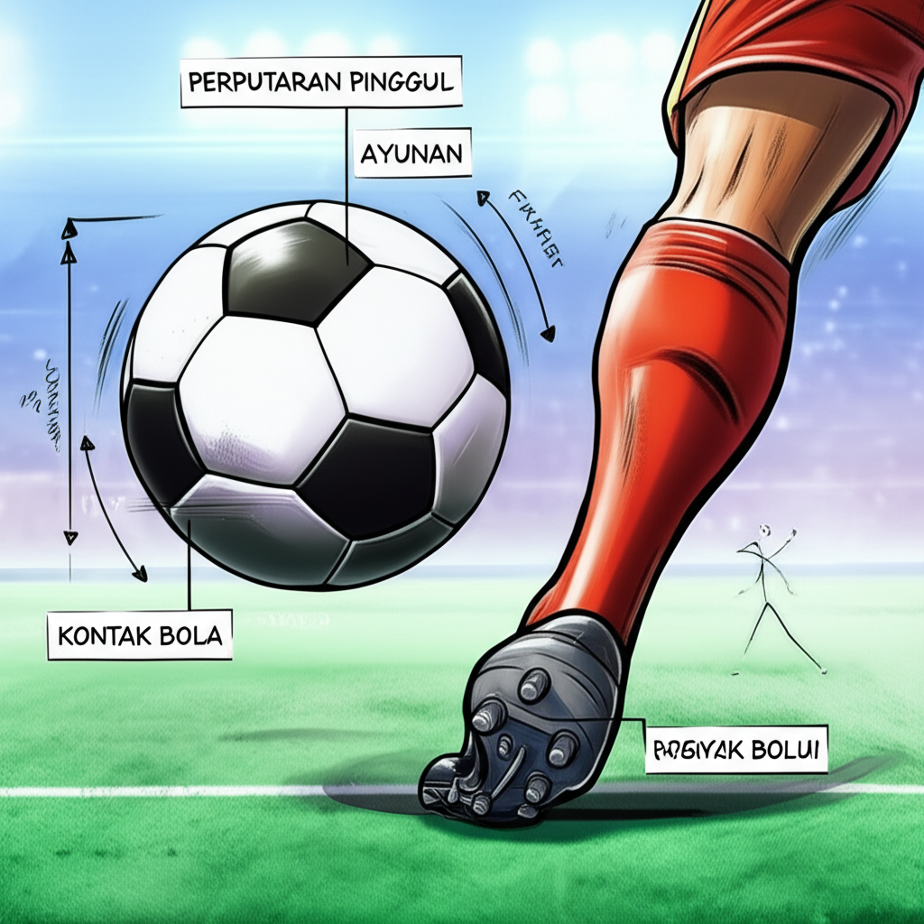 2. Titik Kontak (Contact Point): Bagian kaki yang mengenai bola (punggung kaki/kura-kura, sisi dalam, atau sisi luar) dan bagian mana dari bola yang terkena, adalah faktor penentu lintasan.